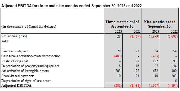 EQ measures the success of the company's strategies and performance based on adjusted EBITDA, which is outlined and reconciled with net loss in the section on the reconciliation of net loss for the period to adjusted EBITDA in the management's discussion and analysis (MD&A). The company defines adjusted EBITDA as net loss from operations before: (a) depreciation of property and equipment and amortization of intangible assets; (b) share-based payments; (c) finance income and costs, net; (d) depreciation of right-of-use assets; (e) restructuring costs; and (f) gain from acquisition-related transaction. Management uses adjusted EBITDA as a measure of the company's operating performance because it provides information on the company's ability to provide operating cash flows for working capital requirements, capital expenditures and potential acquisitions. The company also believes that analysts and investors use adjusted EBITDA as a supplemental measure to evaluate the overall operating performance of companies in its industry.