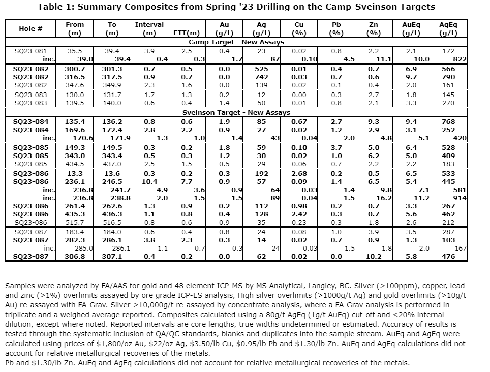 - A 0.7-metre (estimated TT) interval grading 742 g/t Ag, 0.7 per cent Pb and 0.6 per cent Zn (9.7 g/t AuEq or 790 g/t AgEq) from drill hole SQ23-082.