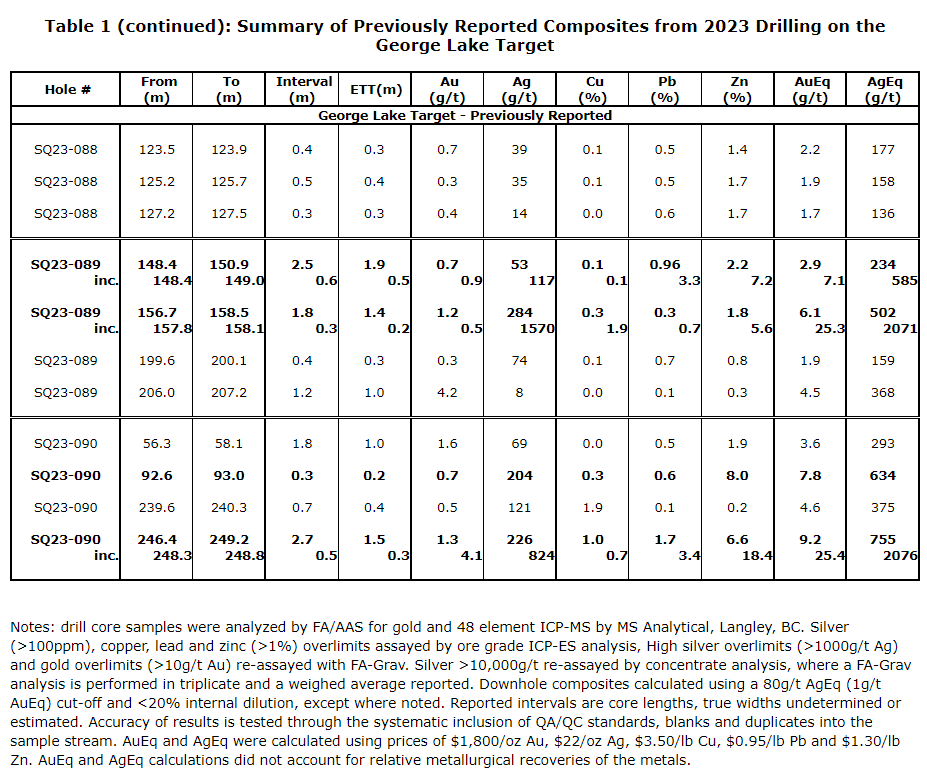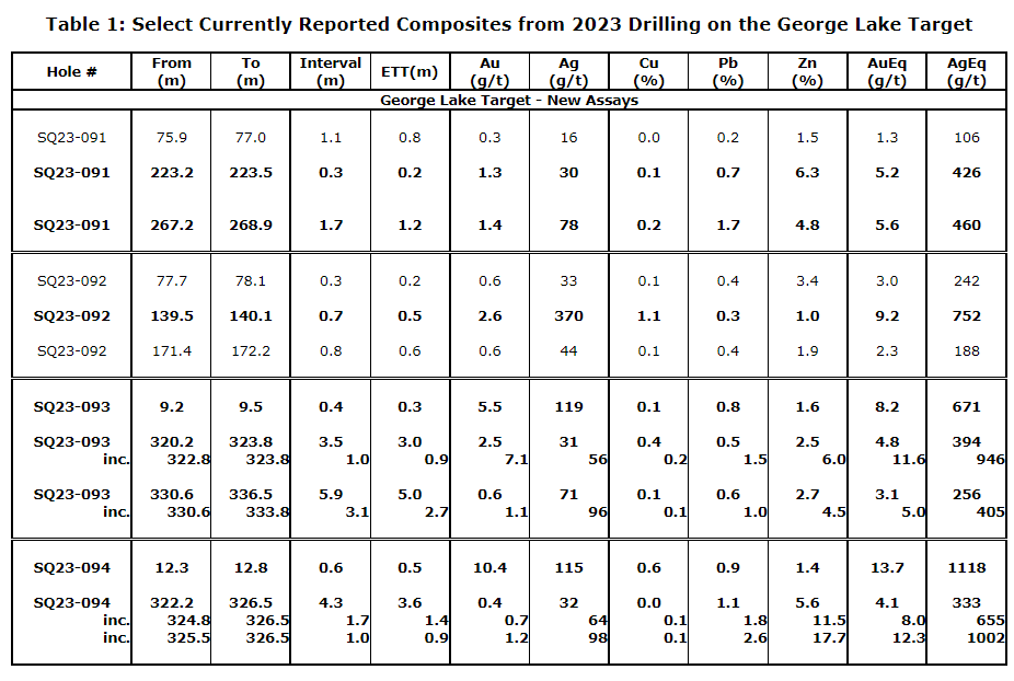 These latest drill results at the George Lake target returned multiple intercepts of precious and base metals, including: