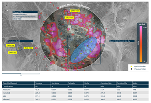 A second hole, ZMD-163, targeting a near surface alteration zone to the north of ZMD-162, intersected wide zones of anomalous Cu mineralization, including 24 metres of 0.1% Cu and ended in anomalous Cu mineralization.