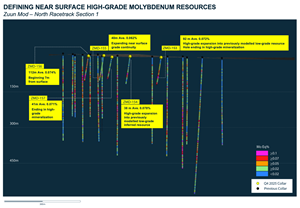 The near surface drilling intersected high-grade Mo and Cu mineralization within the upper 130 metres vertically. Multiple holes returned grades exceeding 0.07% Molybdenum Equivalent (“MoEq”) over downhole lengths of up to 112 metres, with multiple holes ending in mineralization. The results support the updated resource model, confirming both near vertical and sub-horizontal orientation of mineralization and infilling areas previously modeled as having low or no mineralization.