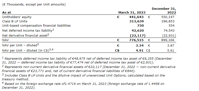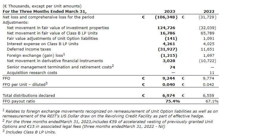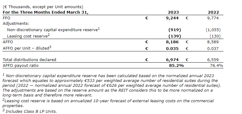 - Adjusted funds from operations (AFFO) per unit decreased by 5.4 per cent to 3.5 euro cents for the three months ended March 31, 2023, compared with 3.7 euro cents in the three months ended March 31, 2022.