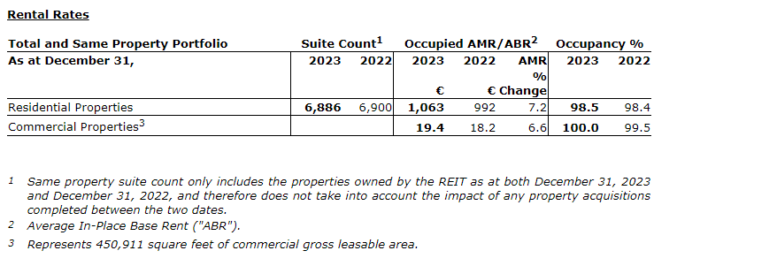 - Occupancy for the residential and commercial properties increased to 98.5 per cent and 100.0 per cent, respectively, as at Dec. 31, 2023, compared with 98.4 per cent and 99.5 per cent, respectively as at Dec. 31, 2022, and is at the high end of the REIT's target range. Moreover, 50.5 per cent of residential vacancies are attributable to suites undergoing renovation upon turnover, and 27.7 per cent of residential vacancies are due to suites held for potential sale relating to the REIT's continuing capital recycling initiatives.