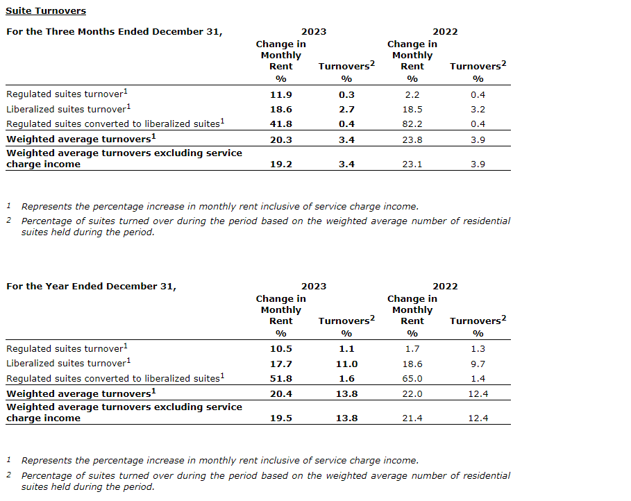 - Turnover was 13.8 per cent for the year ended Dec. 31, 2023, with rental uplift on turnover remaining strong at 20.4 per cent, compared with rental uplift of 22.0 per cent on turnover of 12.4 per cent for the year ended Dec. 31, 2022.