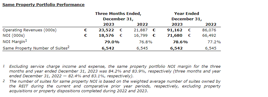 The increases in same property NOI by 10.6 per cent and 7.8 per cent for the three months and year ended Dec. 31, 2023, respectively, compared with the same periods last year, were primarily driven by higher operating revenues from increased monthly rents and reduction in on-site costs, as a result of the abolishment of landlord levy tax. The increases in same property NOI margin including and excluding service charges for the three months and year ended Dec. 31, 2023, are primarily driven by the same reasons for the increases in same property NOI mentioned herein.