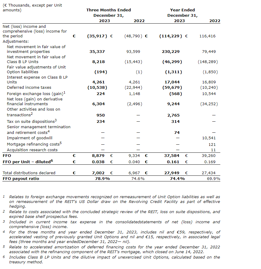 Funds from operations (FFO) per unit decreased by 4.7 per cent to 16.1 euro cents for the year ended Dec. 31, 2023, compared with 16.9 euro cents for the year ended Dec. 31, 2022, primarily driven by increases in interest and other financing costs and current income tax expense, partially offset by the positive impact of increased same property NOI.