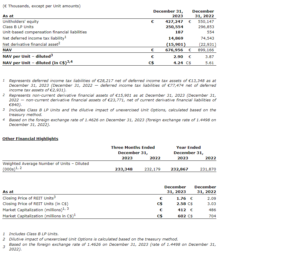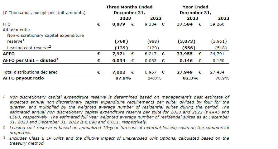 - Adjusted funds from operations (AFFO) per unit decreased by 2.7 per cent to 14.6 euro cents for the year ended Dec. 31, 2023, compared with 15 euro cents for the year ended Dec. 31, 2022, due to the same reasons mentioned herein for FFO per unit.