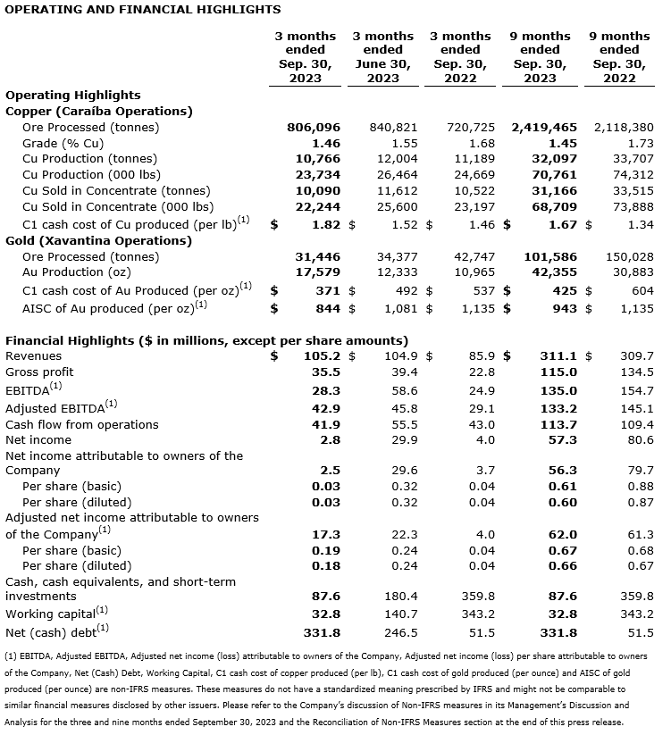 "Two thousand twenty-three continues to be a pivotal year for Ero Copper as our near-term growth projects reach critical milestones and we continue to define and broaden our long-term growth pipeline," said David Strang, chief executive officer. "This strategic execution was evident at the Xavantina operations, where we successfully initiated production from the Matinha vein during the quarter, resulting in record gold production and operating margins. We also made substantial progress at our Tucuma project, as announced earlier this month, and advanced our Pilar 3.0 initiative at the Caraiba operations, where we are nearing completion of the mill expansion project and preparing to commence main sinking of the new external shaft.