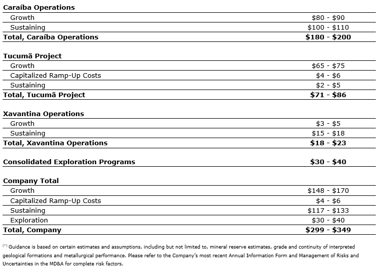 Capital expenditure guidance assumes an exchange rate of $5.10 (U.S.) to one Brazilian real for the Tucuma project based on designated foreign exchange hedges with a weighted-average ceiling and floor of $5.10 and $5.23 to one Brazilian real, respectively. All other capital expenditures assume an exchange rate of $5 to one Brazilian real. Figures presented are in U.S. dollars in millions.
