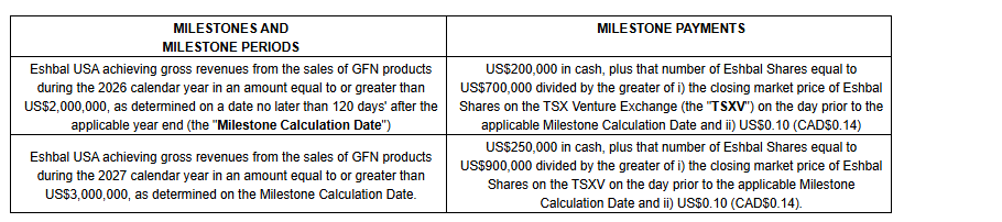 The acquisition of the business of GFN was made pursuant to a bill of sale and assignment agreement among Starcall Broadcasting LLC, doing business as GFN, the company and Eshbal USA Inc. Pursuant to the bill of sale, Eshbal USA will acquire the assets of Starcall used in the business GFN for the aggregate acquisition cost of $736,424.58 (U.S.), with $236,424.58 (U.S.) paid in cash and $500,000 (U.S.) paid by the issuance of 3,846,154 common shares of the company issued at the deemed price of 13 U.S. cents (18 cents) per Eshbal share.
