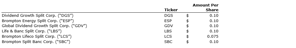 BROMPTON FUNDS DECLARES SPLIT SHARE FUND DISTRIBUTIONS