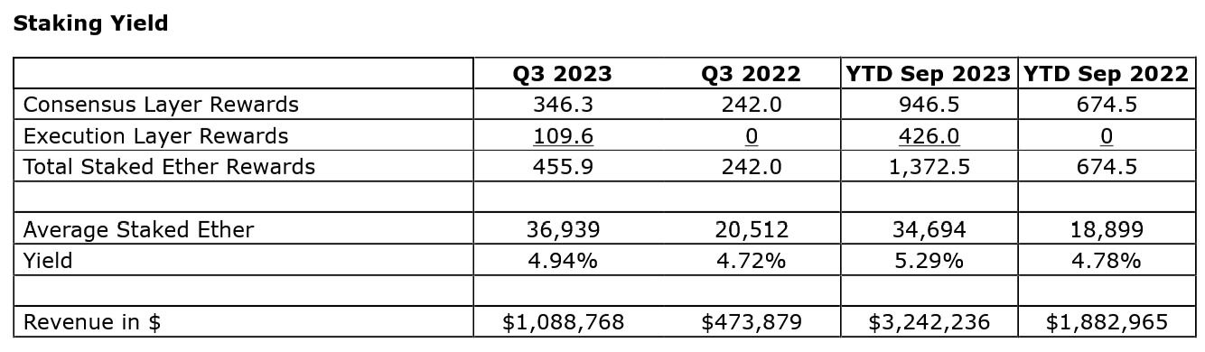 The staking yield for the Company was 4.94% for the three-month period ended September 30, 2023 (4.72% in Q3 2022) and 5.3% for the nine-month period ended September 30, 2023 (4.8% in Q3 2022). The Staked Ether generated Execution Layer Rewards from September 15, 2022 onwards and this increased the overall Staking Rewards yield in the 2023 period compared to the 2022 period.