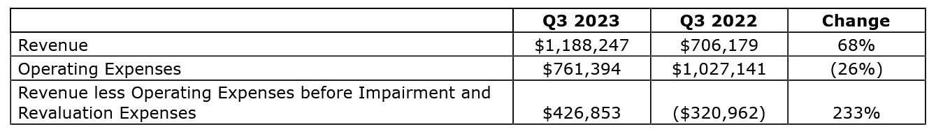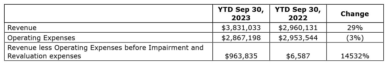 The Company was cash-flow positive, with Revenue less Operating Expenses before Impairment and Revaluation Expenses of $0.4 million, and $1 million respectively for the three- and nine-month periods ended September 30, 2023 (versus ($0.3) million, and $7 thousand for the same periods in 2022).