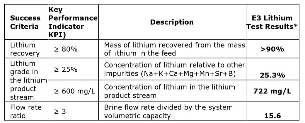 The table below outlines a summary of E3 Lithium's DLE full results.