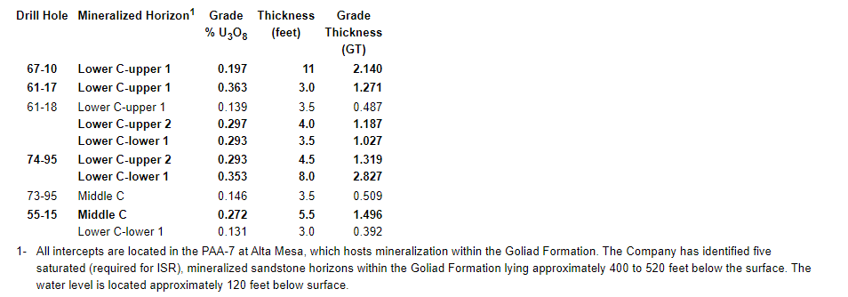 Presently there are six drill rigs working at Alta Mesa with a seventh rig to be added shortly. The wellfield drilling operations, within production authorization area 7 (PAA), which commenced in March, 2023, are advancing rapidly with 81 holes drilled to date with drilling delineating the roll front mineralization within PAA-7. The Middle C unit, a productive sand, essential for ISR, in PAA-3 was not previously known to be mineralized under PAA-7. The drilling program has encountered unexpected significant grade in the Middle C unit underlying PAA-7, with grade thicknesses multiplied by the thickness of the mineralization at or above the cut-off value ranging from 0.481 to 1.888 in four of the holes. Further drilling along trend will continue to delineate this new mineralized sand and is likely to increase the overall mineralization within PAA-7.