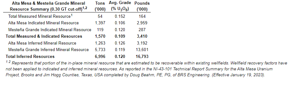 The company advises that it is not basing its production decisions at Alta Mesa or Rosita on a feasibility study of mineral reserves demonstrating economic and technical viability. The production decision is based on known past in situ recovery (ISR) and processing operations at these two production facilities and surrounding lands. However, the company understands that there is increased uncertainty, and consequently a higher risk of failure, when production is undertaken in advance of a feasibility study. In addition, the mineral resource at Alta Mesa includes inferred resources which are considered too speculative geologically to have economic considerations applied to them that would enable them to be categorized as mineral reserves. The company has determined to proceed with a production decision based on past operations at Alta Mesa and Rosita, including past ISR operations in the known mineral resource areas.