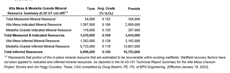 The company advises that it is not basing its production decisions at Alta Mesa or Rosita on a feasibility study of mineral reserves demonstrating economic and technical viability. The production decision is based on known past ISR and processing operations at these two production facilities and surrounding lands. However, the company understands that there is increased uncertainty and consequently a higher risk of failure when production is undertaken in advance of a feasibility study. In addition, the mineral resource at Alta Mesa includes inferred resources, which are considered too speculative geologically to have economic considerations applied to them that would enable them to be categorized as mineral reserves. The company has determined to proceed with a production decision based on past operations at Alta Mesa and Rosita, including past ISR operations in the known mineral resource areas.
