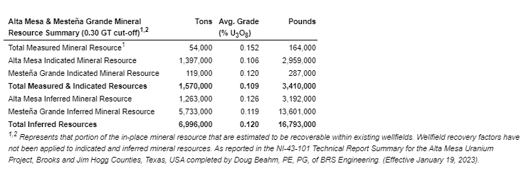 The company advises that it is not basing its production decisions at Alta Mesa CPP or Rosita CPP on a feasibility study of mineral reserves demonstrating economic and technical viability. The production decision is based on known past In-Situ Recovery (ISR) and processing operations at these two production facilities and surrounding lands. However, the company understands that there is increased uncertainty, and consequently a higher risk of failure, when production is undertaken in advance of a feasibility study. The company has determined to proceed with a production decision based on past operations at the Alta Mesa CPP and Rosita CPP, including past ISR operations in the known mineral resource areas.