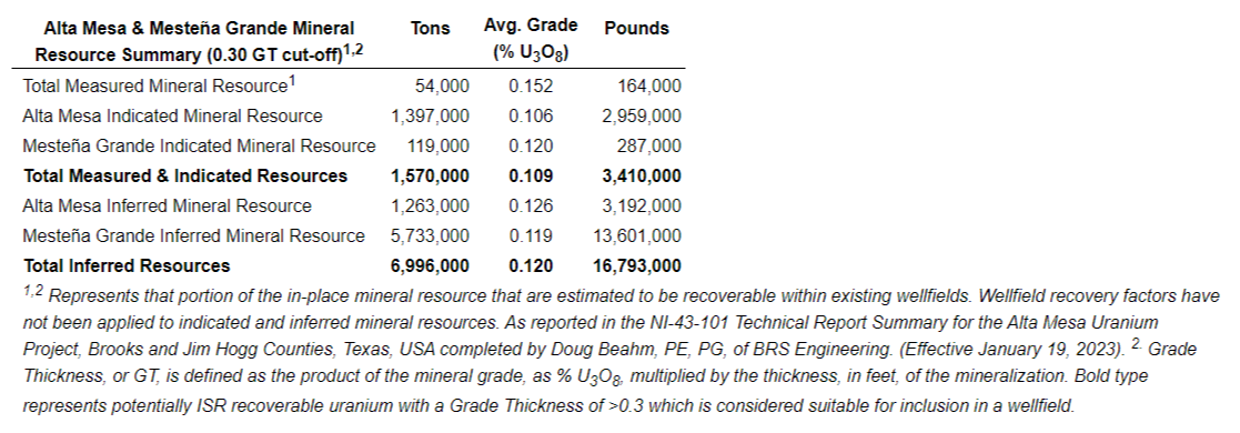 Alta Mesa is an ISR uranium project in south Texas, with a fully licensed central processing plan (CPP) with 1.5 million pounds U3O8 per year capacity through the existing ion exchange (IX) circuit that is planned for restart in early 2024. The CPP has the capacity to process, dry and package up to two million pounds U3O8 per year, and that capacity can be met with the installation of additional IX resin processing circuits similar to those in use at EnCore's Rosita CPP. The project hosts a National Instrument 43-101 resource of 3.41 million pounds at 0.109 per cent U3O8 in the measured and indicated category with an additional 16.79 million pounds at 0.120 per cent U3O8 in the inferred category, and there is significant potential to grow the mineral resources within the approximately 200,000-acre (80,900-hectare) project area. In February, 2023, EnCore acquired the Alta Mesa project for $120-million (U.S.) from Energy Fuels Inc.