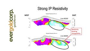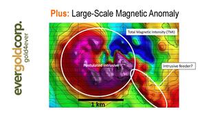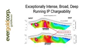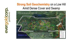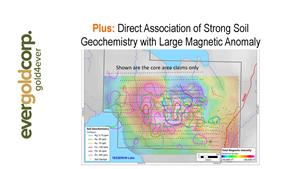 The DEM Property hosts the newly developed, never drilled DEM prospect, a roughly 4km2 target area exhibiting strong multi-element geochemical anomalism in soils, including highs to 2.1 ppm Au, 160 ppm Ag, 0.5% Pb, 0.41% Zn, 0.76% As, and 651 ppm Cu, directly associated with an underlying large scale donut-shaped magnetic anomaly and exceptionally strong, deep-running IP chargeability, suggesting high discovery potential. The exceptional merits of the DEM prospect may be viewed in a presentation available from the Company’s website at www.evergoldcorp.ca, and in Figures 2 to 6, below.