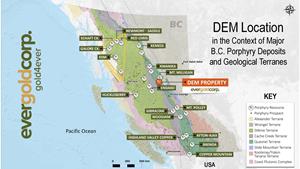TORONTO, Aug. 02, 2023 (GLOBE NEWSWIRE) -- Evergold Corp. (TSX-V: EVER, OTC: EVGUF, WKN: A2PTHZ) (“Evergold” or the “Company”) is pleased to announce that it has entered into an option agreement (the “Option Agreement”) with non-arms-length vendors Charles Greig and Alex Walcott (“the Optionors”), for the exclusive right and option to acquire a 100% interest in the drill-ready, highly prospective DEM gold-silver property (the “DEM Property), located in central British Columbia (Figure 1). A NI 43-101 compliant technical report is being prepared for the DEM Property and is expected to be delivered by an independent Qualified Person in mid-August and prior to the closing of the Option Agreement.