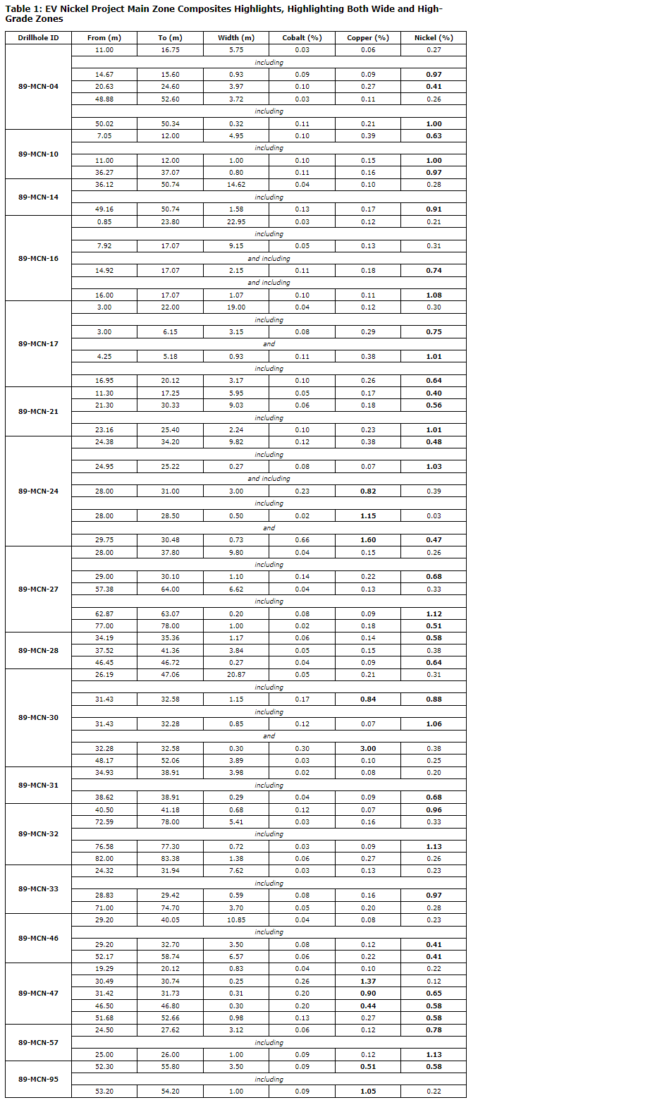 EV MINERALS HIGHLIGHTS HISTORIC MAIN ZONE RESULTS AT EV NICKEL PROJECT IN SAGUENAY-LAC-SAINT-JEAN REGION, QUEBEC