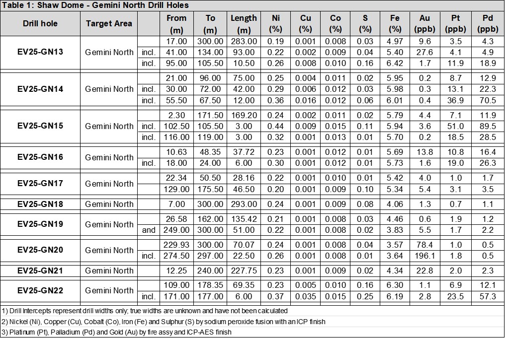 EV NICKEL REPORTS RESULTS OF 2025 DIAMOND DRILL HOLE PROGRAM - EXTENSION OF NICKEL MINERALIZATION ON GEMINI NORTH