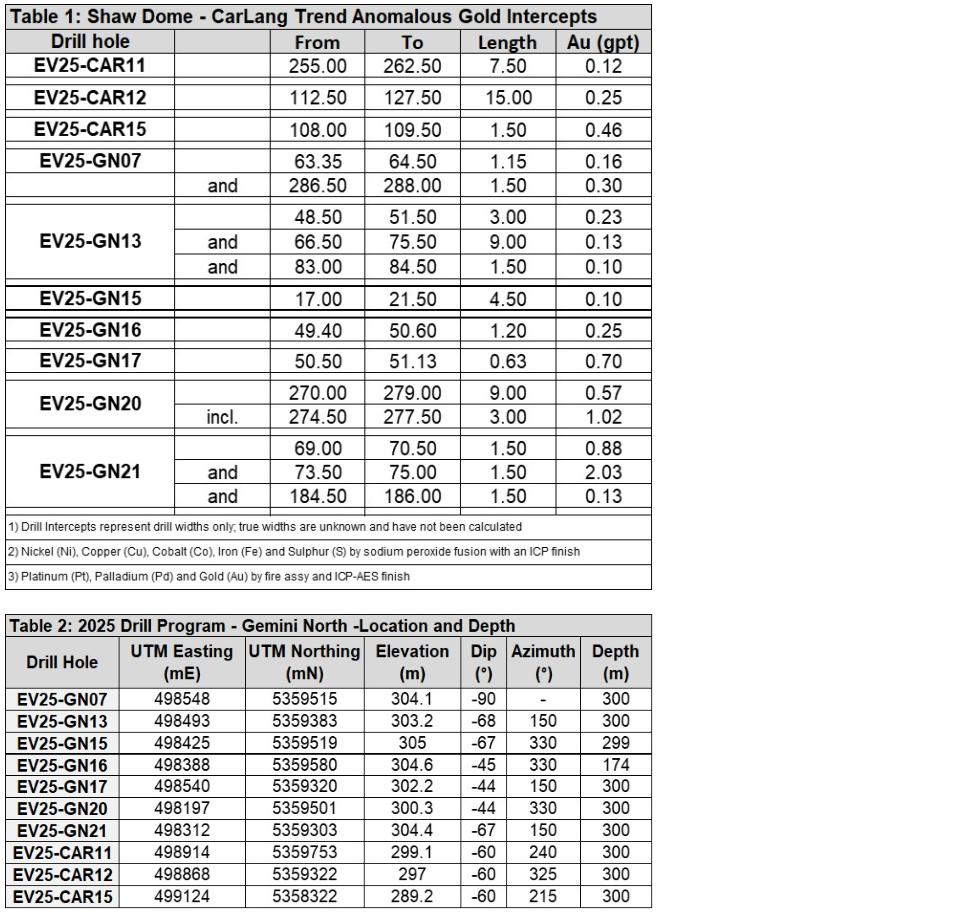 EV Nickel Inc. has discovered anomalous gold mineralization associated with the Gemini North nickel zone at its Shaw Dome project, Timmins, Ont. Results from the company's 2025 diamond drilling program have identified gold mineralization above background level concentrations of greater than 0.02 gram per tonne (gpt) Au over a minimum drill intersection of 1.5 metres in 21 of 28 drill holes completed to date (see press releases dated March 19, 2025, and Jan. 20, 2026).