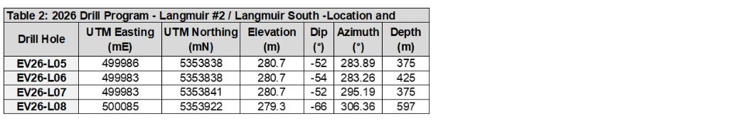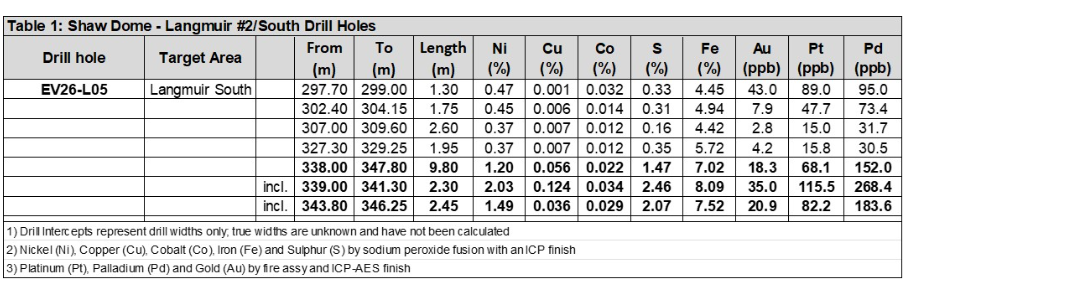 "The result of the first hole confirms that the Langmuir South zone represents an excellent target for significant high-grade nickel sulphides," said Paul Davis, vice-president of exploration. "The Langmuir No. 2 and Langmuir South projects represent a unique opportunity to strengthen our already impressive stable of nickel deposits and mineralized zones. With mineralization encountered at relatively shallow vertical depth and in proximity to existing infrastructure at the historic Langmuir No. 2 mine, we believe there is strong potential to rapidly advance this area. Our 2024 drill results below the Langmuir No. 2 mine and hole EV26-L05 on the Langmuir South zone demonstrates that the area is extremely fertile in regard to high-grade nickel sulphide mineralization and its capacity for meaningful near-term resource growth."