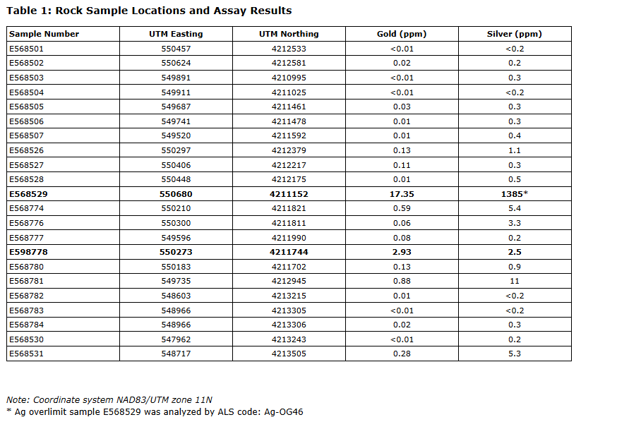 All samples were collected in the field using a hammer and/or chisel. Sample locations were recorded using a handheld GPS with samples placed in prelabelled plastic bags. Metal tags with corresponding sample numbers were attached to flagging tape and tied to a rock adjacent to each sample site for location reference. Samples were securely transported by field staff to ALS USA's laboratory in Reno, Nev., for standard sample preparation which includes drying at 60 degrees Celsius, crushing to 90 per cent passing two millimetres, splitting with Boyd Rotary Splitter, and pulverized to 85 per cent passing 75 micrometres. The pulps for gold analysis were analyzed by gold fire assay (code Au-AA26) in Reno. The pulps for 36 elements using aqua regia digestion with ICP-AES finish (code ME-ICP41) were shipped by ALS to ALS labs in Vancouver, Canada. Reported Ag results use lab method ME-ICP41. Ag overlimit sample E568529 was also analyzed by Ag-OG46 (shown in Table 1). A quality assurance/quality control protocol was incorporated into the program, and a blank sample was inserted into the sample string. ALS is independent of the company.
