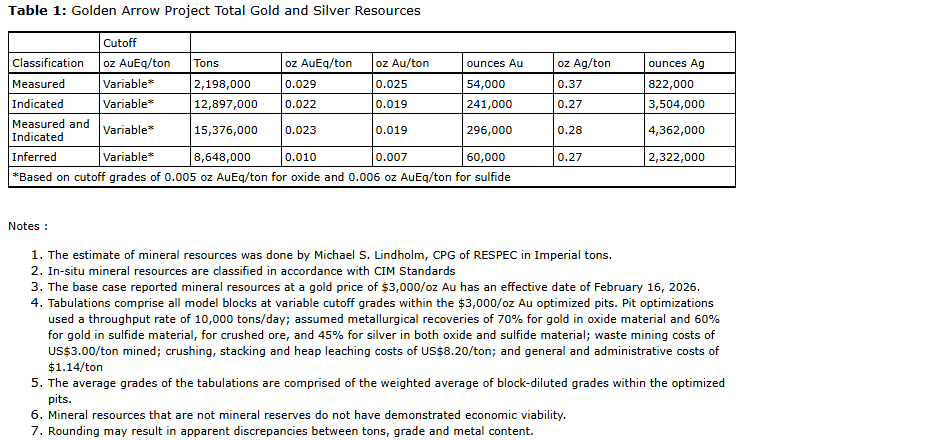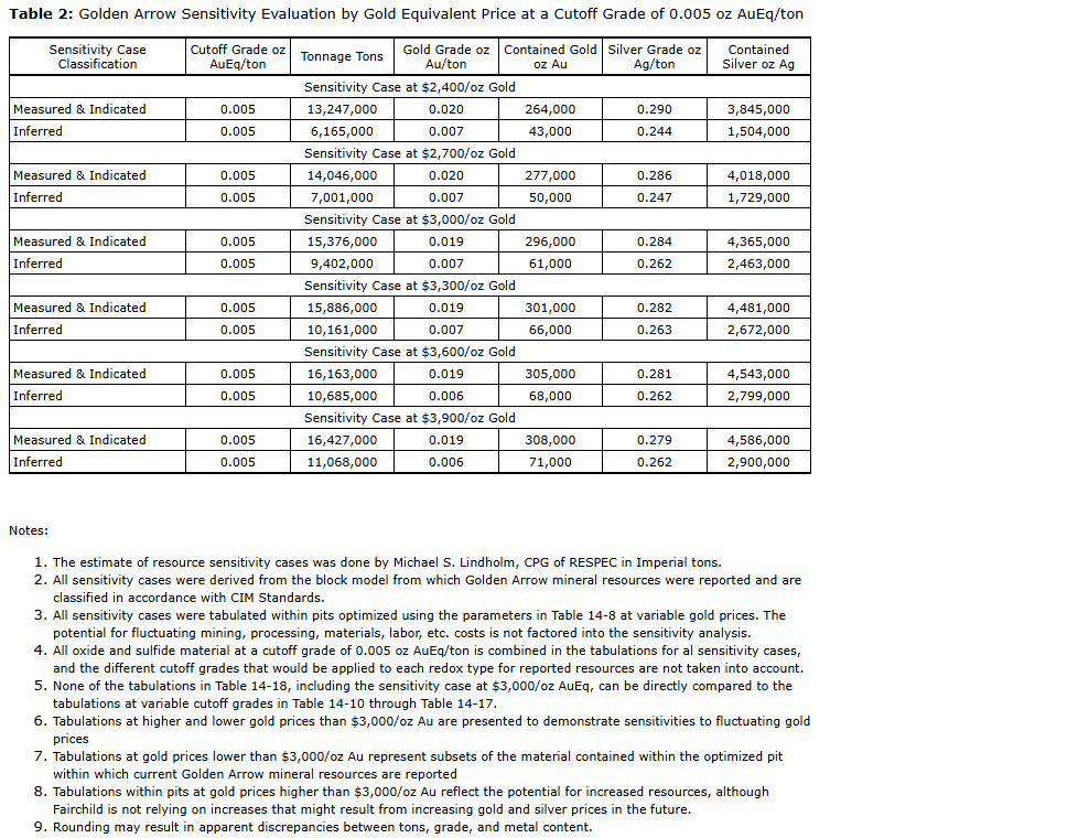 FAIRCHILD GOLD ANNOUNCES FILING OF UPDATED NI 43-101 TECHNICAL REPORT ON GOLDEN ARROW AU-AG PROJECT, WALKER LANE GOLD TREND, NEVADA