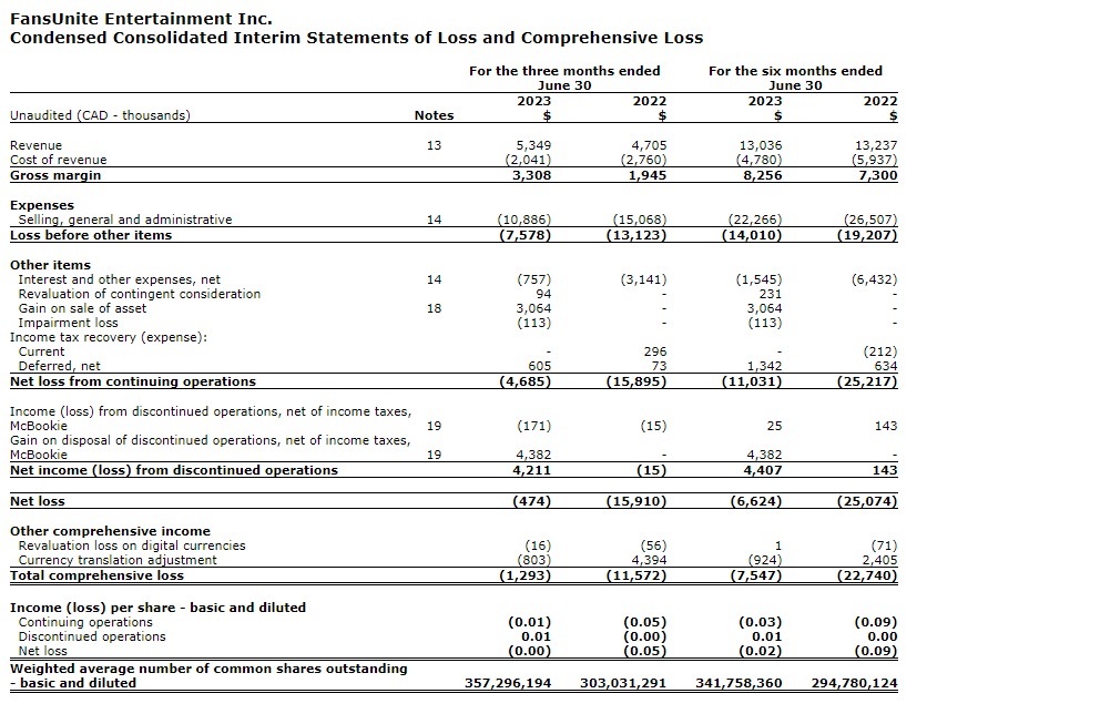 Fansunite Entertainment Inc. has filed its condensed consolidated interim financial statements and associated management's discussion and analysis (MD&A) for the three- and six-month periods ended June 30, 2023. All amounts are stated in Canadian dollars unless otherwise indicated (as is always the case on Stockwatch unless otherwise stated).
