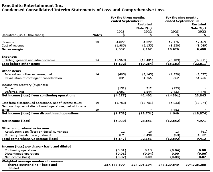 Fansunite Entertainment Inc. has filed its condensed consolidated interim financial statements and associated management's discussion and analysis (MD&A) for the three- and nine-month periods ended Sept. 30, 2023. All amounts are stated in Canadian dollars unless otherwise indicated.