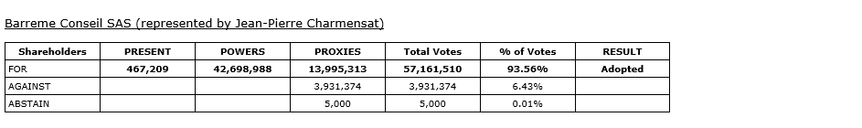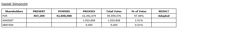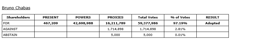 In accordance with French law, shareholders of the company, when voting in elections for directors, are given the option to vote for or against/abstain for the director nominees, meaning that it is not possible for nominees for directors to receive a majority of withhold votes and retain their position as directors of the company. The director nominees, as listed in the company's management proxy circular dated March 14, 2025, for the meeting, were elected as directors of the company at the meeting. The votes submitted for each director are detailed in the attached tables.