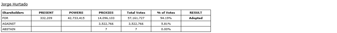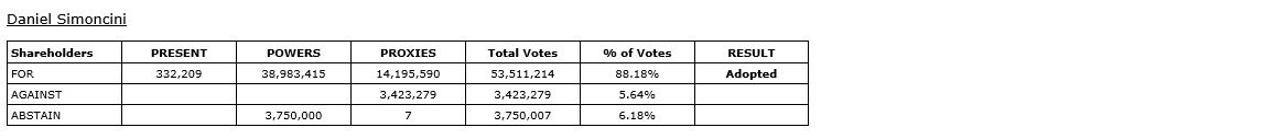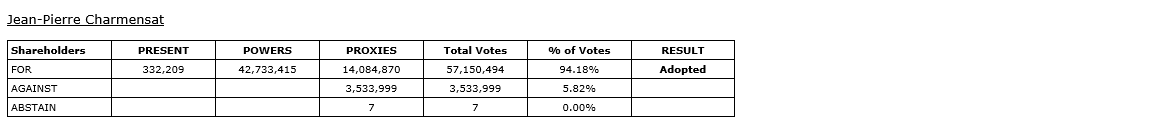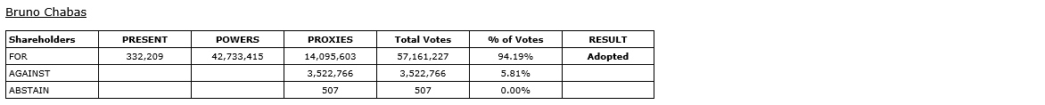 In accordance with French law, shareholders of the company, when voting in elections for directors, are given the option to vote for or against/abstain for the director nominees, meaning that it is not possible for nominees for directors to receive a majority of withhold votes and retain their position as directors of the company. The director nominees, as listed in the company's management proxy circular dated March 6, 2026, for the meeting, were elected as directors of the company at the meeting. The votes submitted for each director are detailed in the attached tables.