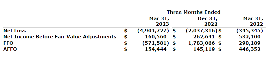 - AFFO (adjusted funds from operations) was approximately $200,000, in comparison with the $400,000 reported for the three months ended March 31, 2022, and the $100,000 reported for the three months ended Dec. 31, 2022.