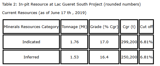 The current mineral resource at the Berkwood graphite project includes in-pit constrained resource totalling 1,755,300 tonnes of indicated resources at 17.00 per cent Cgr (graphitic carbon) and 1,526,400 tonnes in inferred resources at 16.39 per cent Cgr.