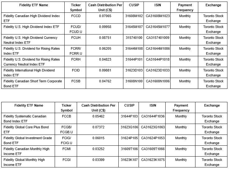 FIDELITY INVESTMENTS CANADA ULC ANNOUNCES CASH DISTRIBUTIONS FOR FIDELITY HIGH DIVIDEND FACTOR ETFS, FIXED INCOME ETFS AND MONTHLY HIGH INCOME ETFS