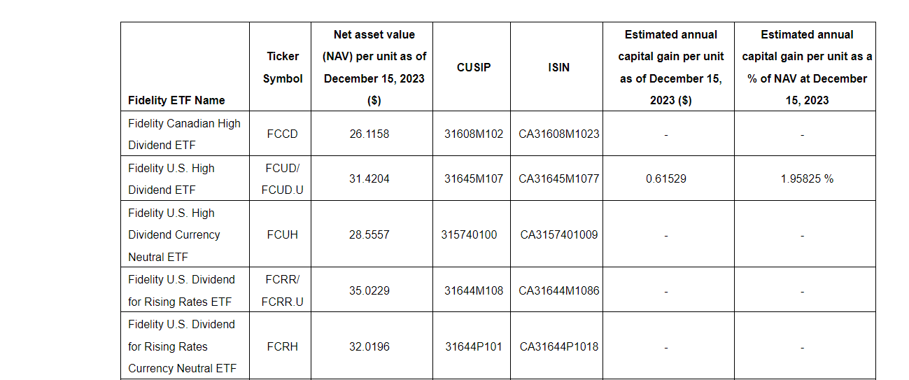 Fidelity Investments Canada ULC has estimated 2023 annual reinvested capital gains distributions for Fidelity's suite of exchange-traded funds and the ETF series units of Fidelity mutual funds. Please note that these are estimated amounts only as of Dec. 18, 2023, and could change if the Fidelity ETFs and Fidelity funds experience subscriptions or redemptions prior to the ex dividend date or may change for other unforeseen reasons.