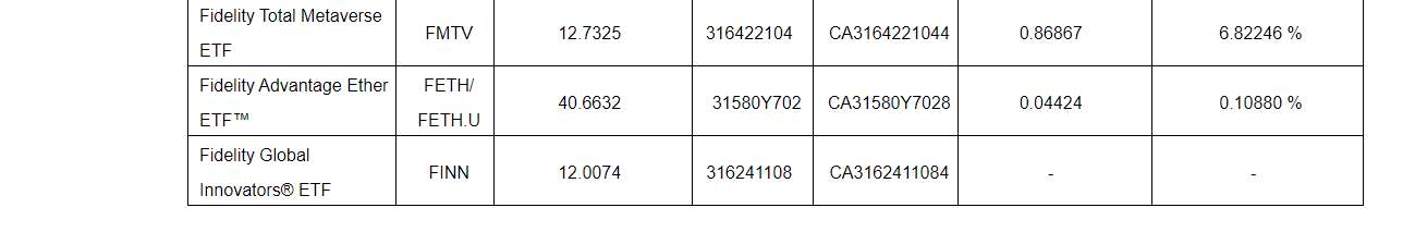 On Nov. 21, 2023, and Dec. 18, 2023, Fidelity estimated 2023 annual reinvested capital gains distributions for the Fidelity ETFs and ETF series of the Fidelity funds. Subsequent to these estimates, investor activity has led to changes to the annual capital gains per unit for the Fidelity ETFs and ETF series of the Fidelity funds, including material changes for Fidelity U.S. Low Volatility ETF, Fidelity International Value ETF, Fidelity All-in-One Growth ETF and Fidelity Greater Canada Fund. Please be advised that the distributions declared in this press release replace those stated in the Nov. 21, 2023, and Dec. 18, 2023, press releases for the Fidelity ETFs and ETF series of the Fidelity funds.