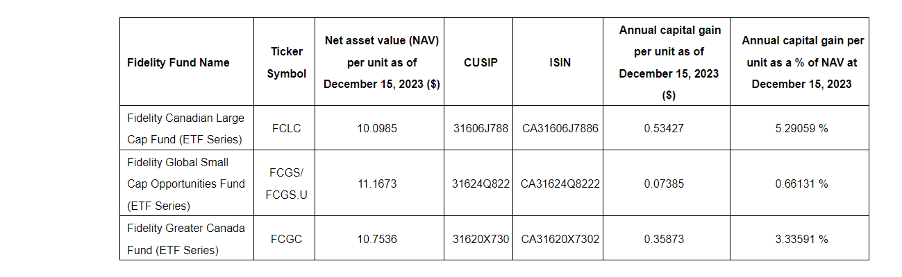 FIDELITY INVESTMENTS CANADA ULC ANNOUNCES FINAL 2023 ANNUAL REINVESTED CAPITAL GAINS DISTRIBUTIONS FOR FIDELITY ETFS AND ETF SERIES OF FIDELITY MUTUAL FUNDS