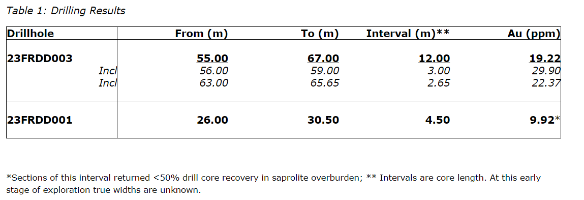 - Drill hole 23FRDD001 returned 4.5 m (core length) of 9.92 g/t Au (see attached table).