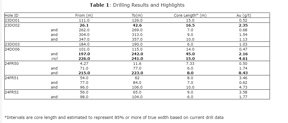 - Hole 24DO06 intercepts 45* m of 2.16 g/t Au;