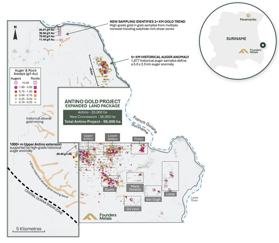 Founders Metals is a Canadian-based exploration company focused on advancing the Antino Gold Project located in Suriname, South America, in the heart of the Guiana Shield. Antino is 56,000 hectares and has produced over 500,000 ounces of gold from historical surface and alluvial mining to date1. The Company is systematically advancing one of Suriname's most promising gold exploration and development opportunities with drill-confirmed, district-scale potential. Founders is committed to responsible exploration, community engagement, and delivering long-term value to shareholders through technical excellence and strategic growth in the Guiana Shield.