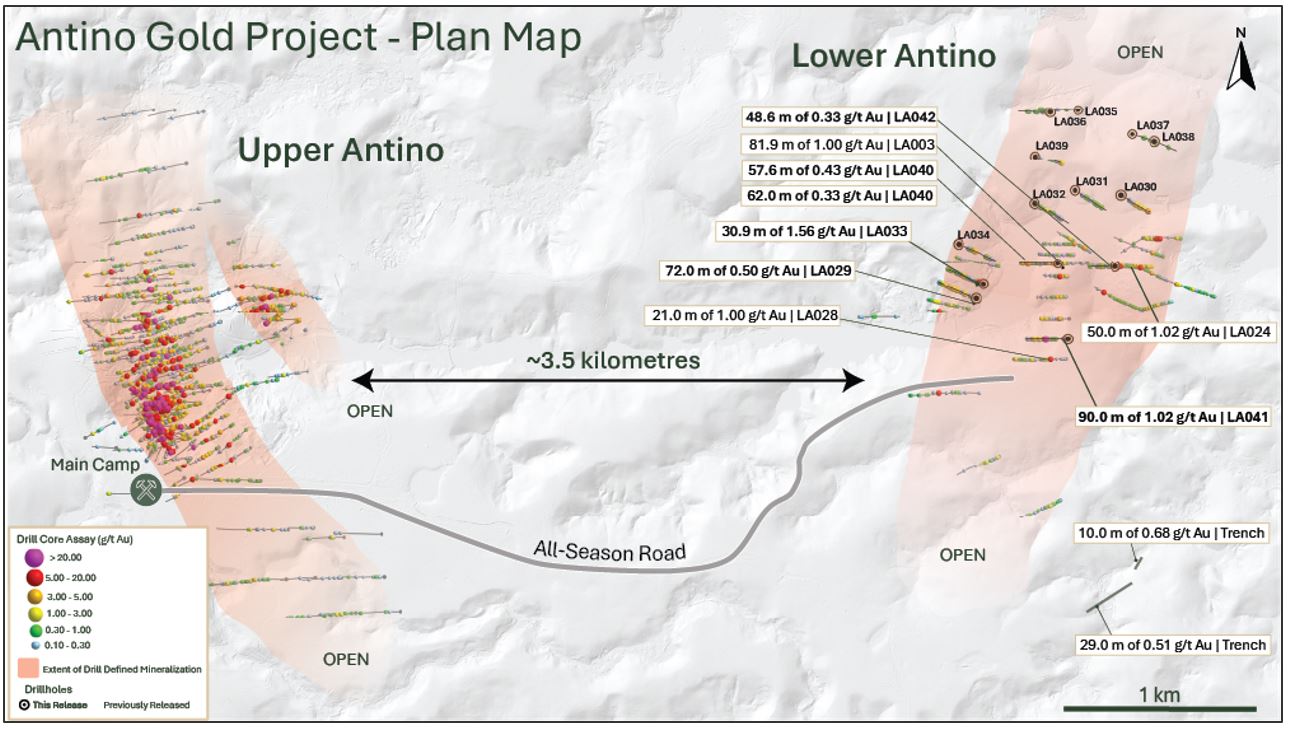 - Consistent grade over wide intercepts: 90.0 m of 1.02 g/t Au (LA041) and 30.9 m of 1.56 g/t Au (LA032) are excellent examples of broad mineralized intervals at Lower Antino; other previously released intervals include 81.9 m of 1.01 g/t Au (LA003) and 50.0 m of 1.02 g/t Au (LA024)