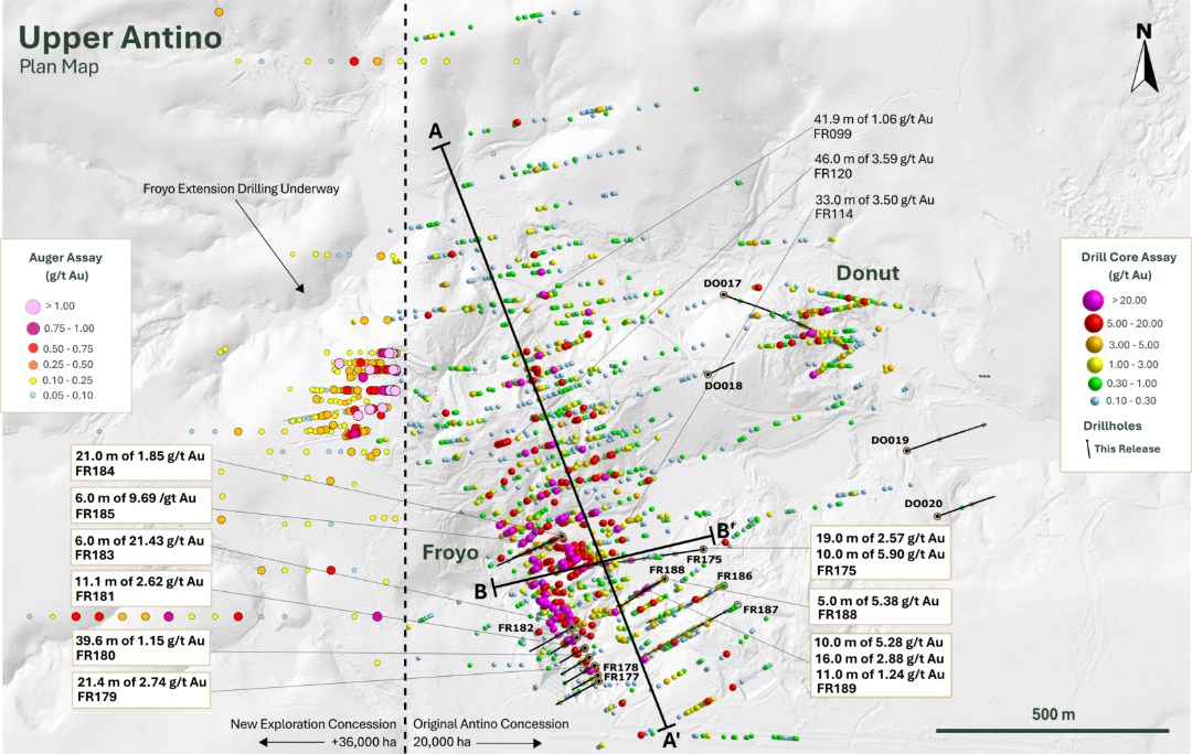 - Follow-up drilling at Upper Antino with strong near-surface results including: