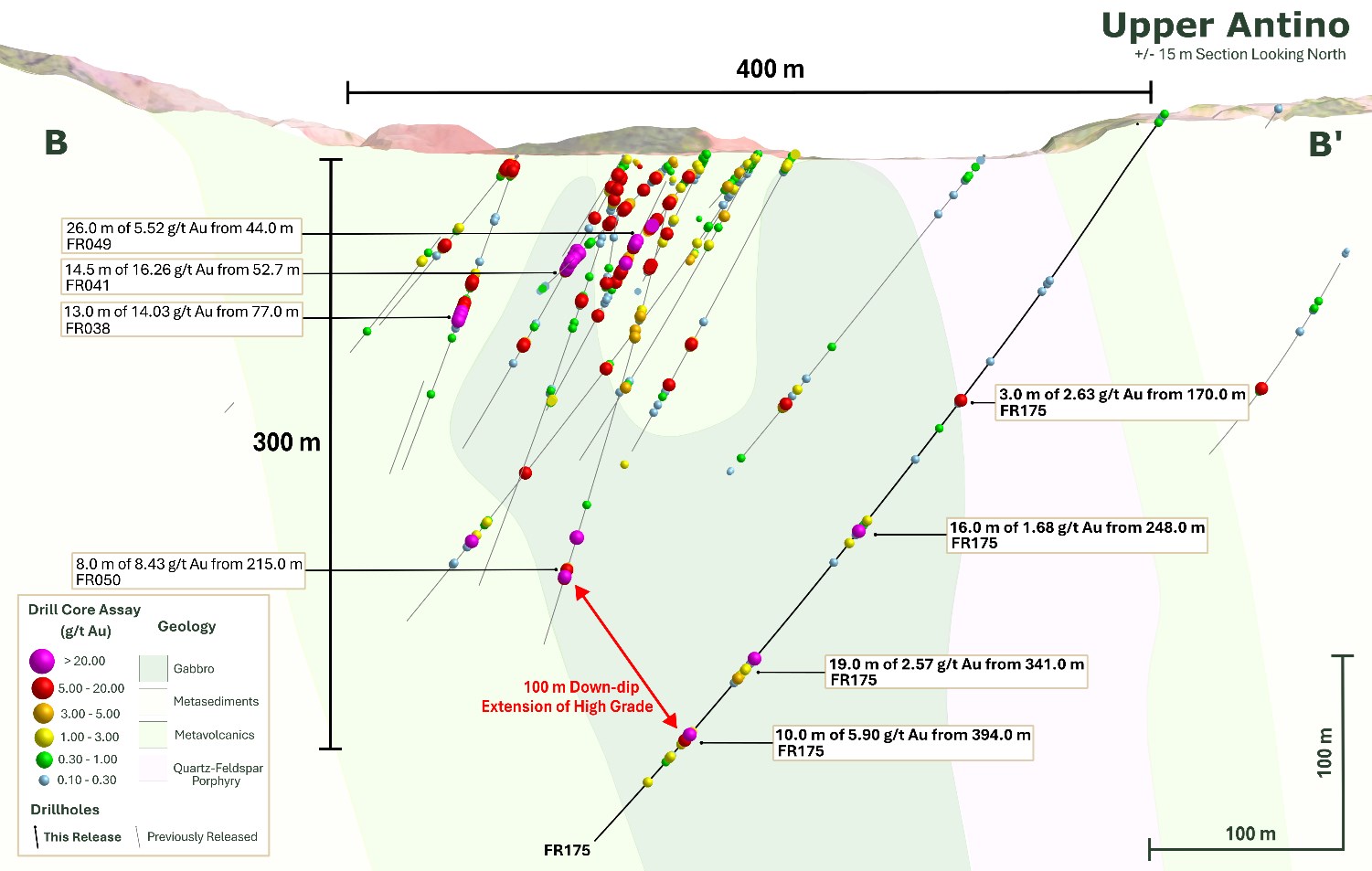 Colin Padget, President & CEO, commented, "These results confirm the robustness of Upper Antino's high-grade gold system. The 10-metre intercept of nearly 6 g/t gold from 394 metres downhole in FR175 confirms we're successfully tracking these structures along strike and deeper into the system. Equally important, follow-up shallower drilling continues to deliver exceptional grades with intervals like the 6 metres of 21.43 g/t gold in drillhole FR183 further reinforcing the high-grade nature of the Upper Antino gold system. With ongoing systematic drilling across multiple targets, we're building a comprehensive understanding of Antino and are positioning ourselves to further define both high-grade and bulk tonnage opportunities across the district."