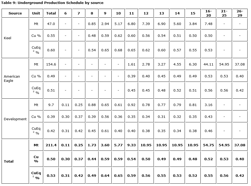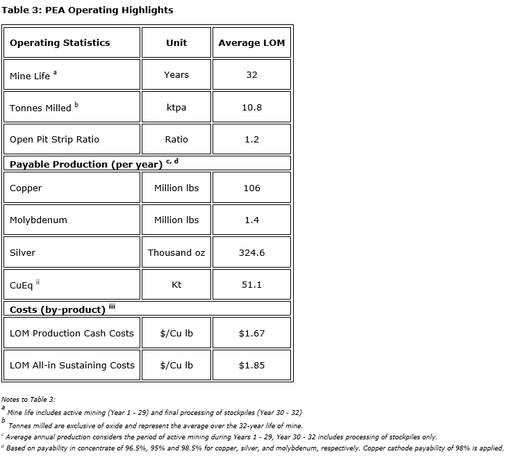 - Long-life production profile: average anticipated payable production during active mining of 51,100 copper equivalent tonnes per year, with peak production of 82,100 tonnes CuEq in year two, generating 3.4 billion pounds payable CuEq metal over the anticipated life of mine (3.2 billion pounds copper, 45.1 million lb molybdenum and 9.7 million troy ounces silver);