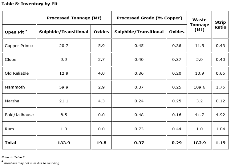 Copper Prince would be the first satellite pit to be mined. Waste in the early periods would be sent east to the external storage facility. Once the Copper Prince and Globe pits are mined out in year three, the pits would be expected to serve as a backfill facility for waste rock from the Mammoth, Globe and Rum pits. After Old Reliable is depleted in year four, it would serve as a backfill facility for Mammoth waste. By year five and six, phases 2 and 3 of the Mammoth pit would be advancing along with the eastern satellite pits Marsha, Bald and Jailhouse (the latter two would be mined together). Waste from these phases would be sent to the adjacent external waste facility due to haulage efficiencies. Mineralized material from Marsha and Bald/Jailhouse would be hauled along in-pit haul roads in the Mammoth pit. The Rum pit is a small pit located in the northwest of the project area and would be mined in year seven. Open-pit mining is expected to conclude in year eight, when Bald is exhausted.
