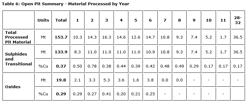 The base annual throughput would be primarily of sulphide material, with some transitional material mined from the open pits. Oxide material recovered near surface in the early years of the anticipated mine life would be segregated and processed separately in a heap leach facility, in addition to the 11.0 Mt base annual throughput.